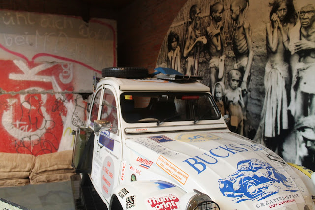 | En el fondo se ve un pedazo del muro de Berlín y un auto que viajó por todo el mundo |